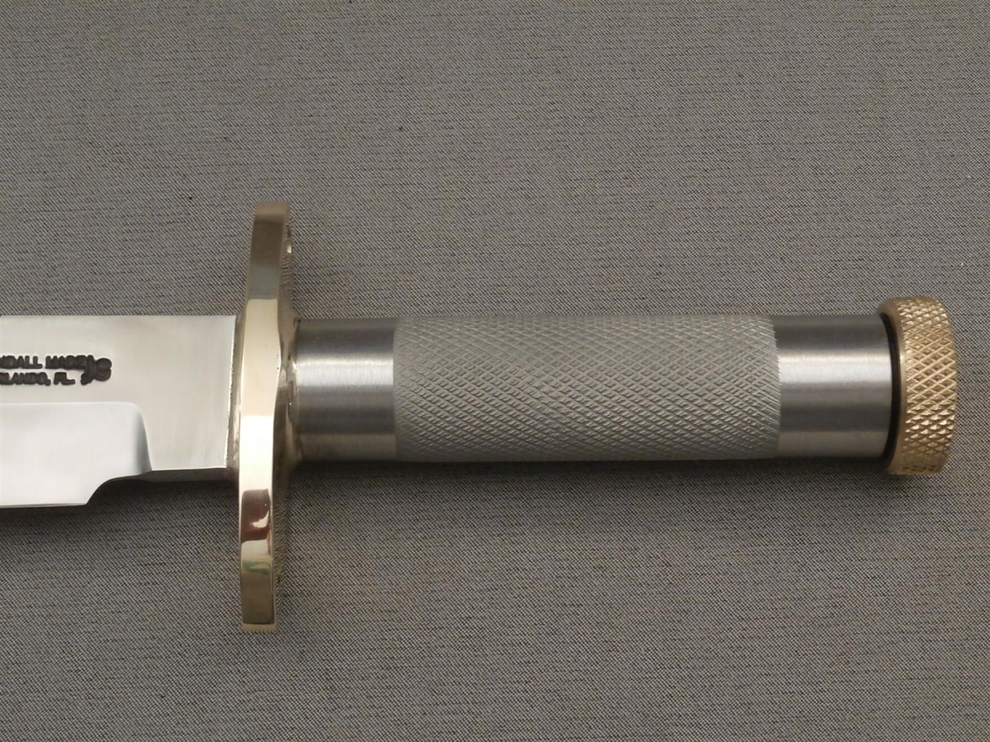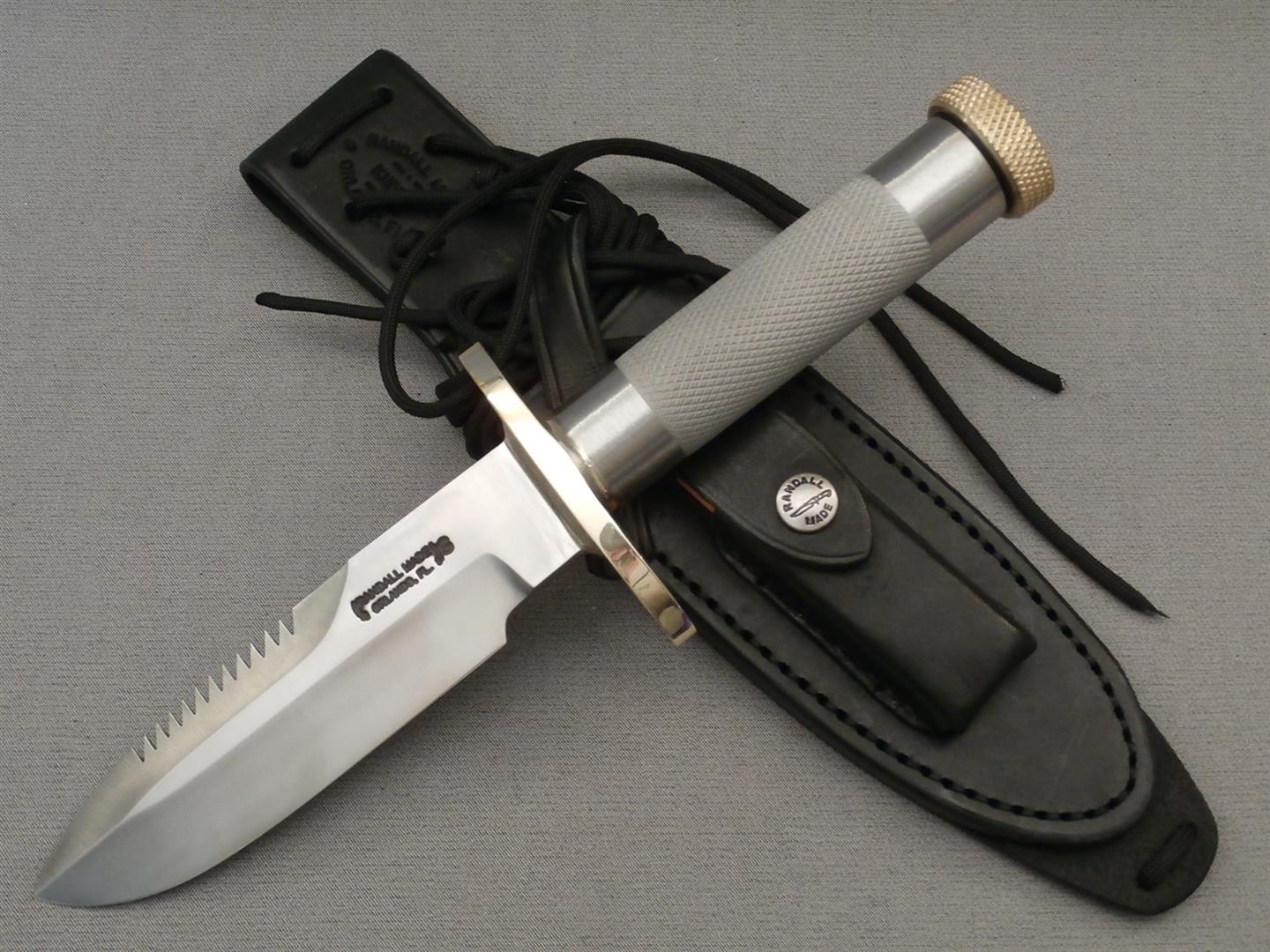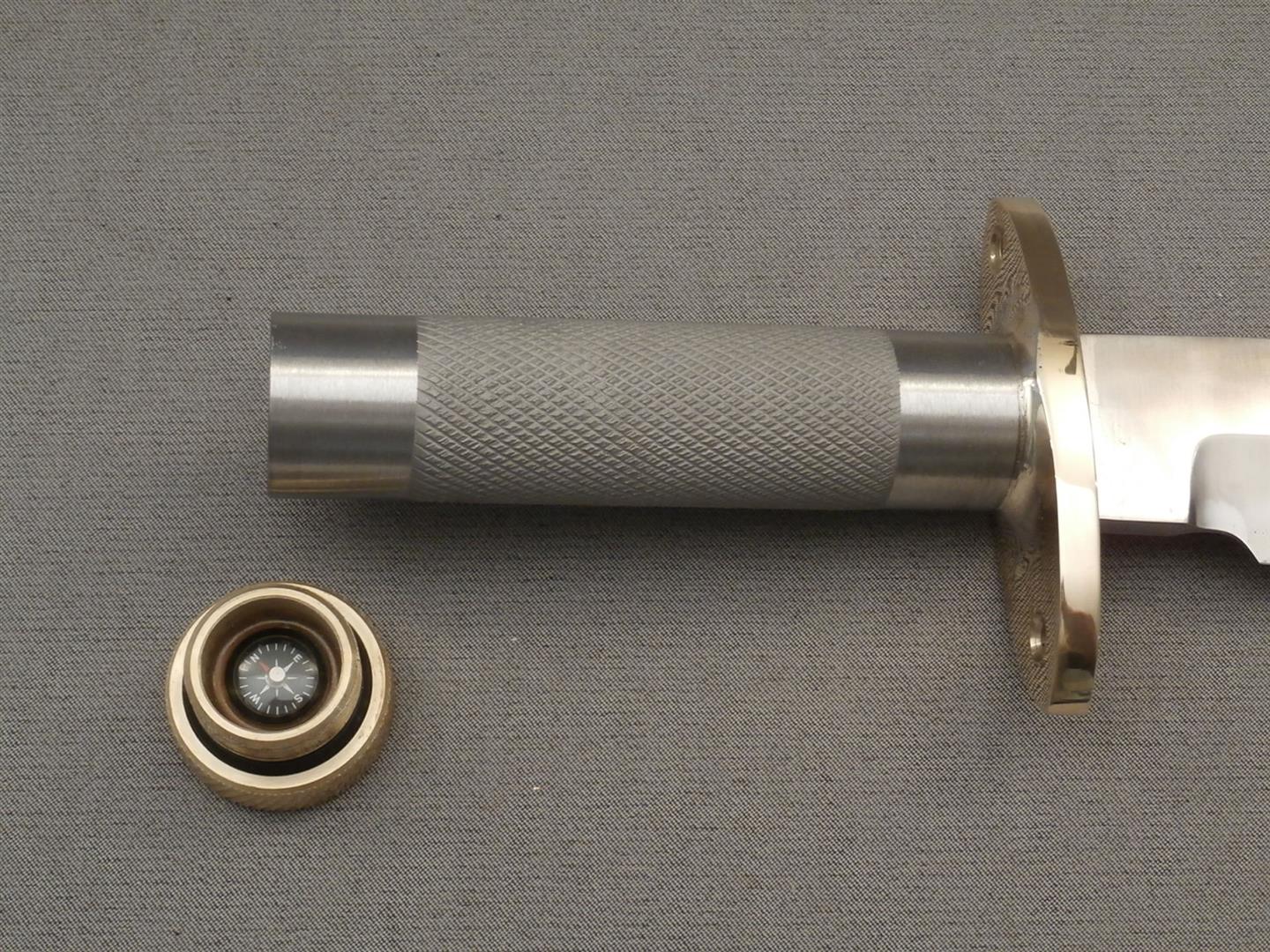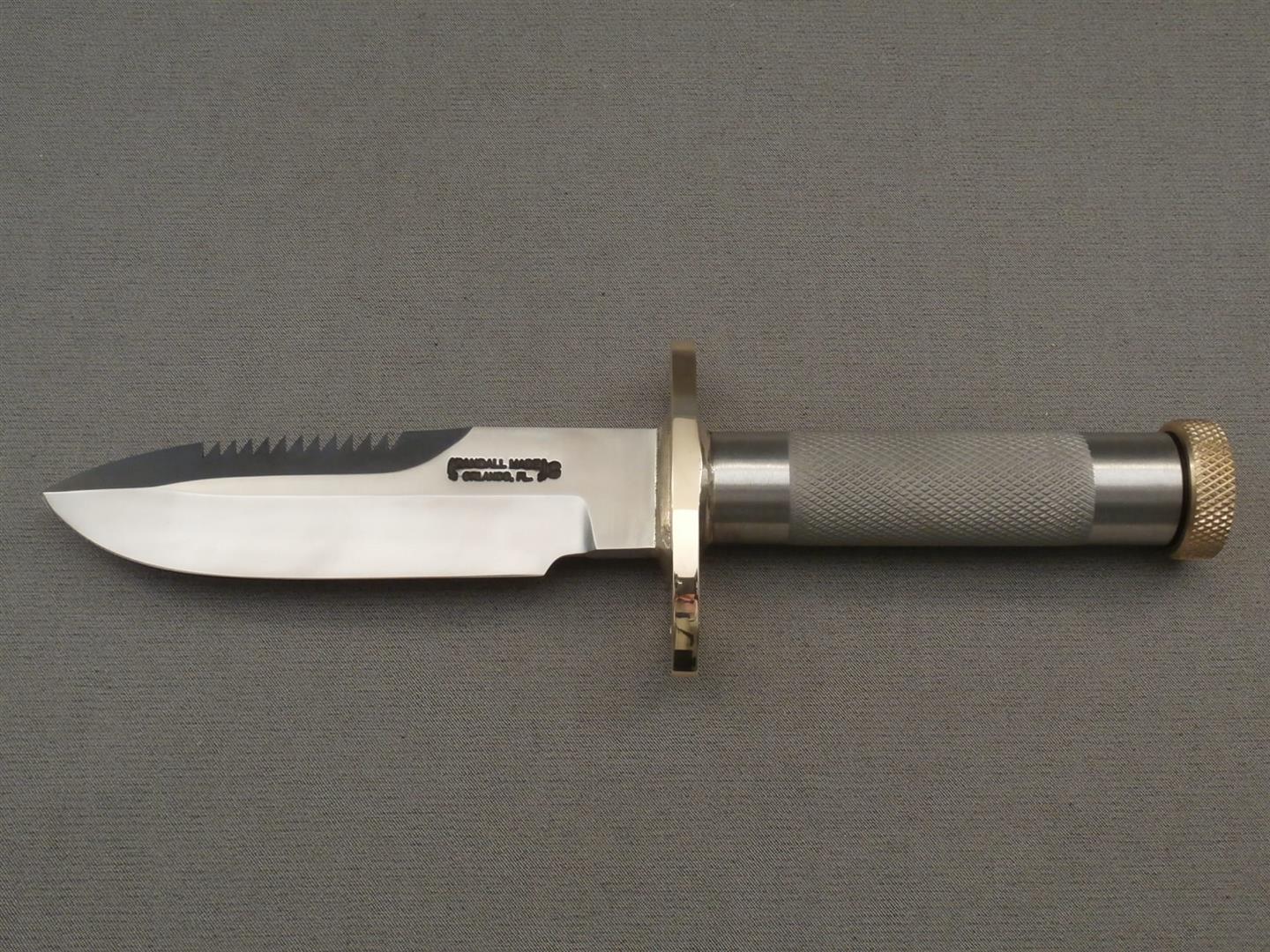 Blade length of 7 1/2″ or 5 1/2″ with sawtooth edge on top (sawteeth not offset). Approx 4 3/4″ stainless steel tubular handle, 1″ diameter, silver soldered to 1/4″ oblong brass hilt, fitted with removable, threaded brass butt cap and waterproof “O” ring. Flared holes in top and bottom of hilt accommodate wrist thong.