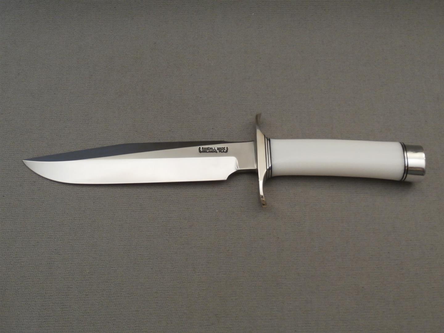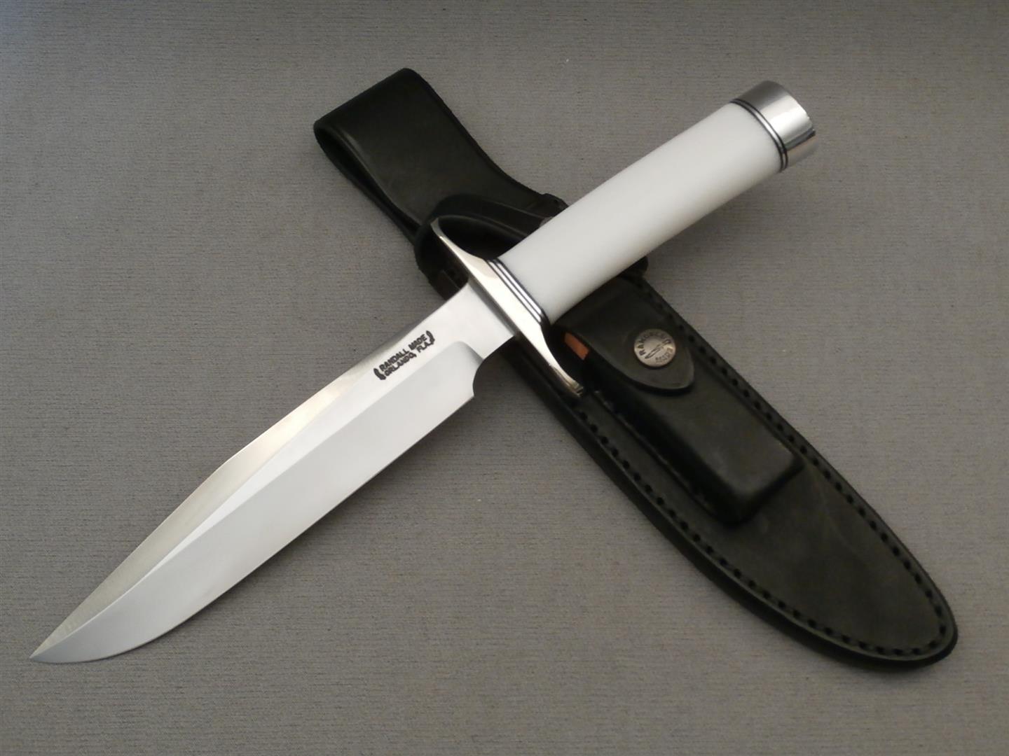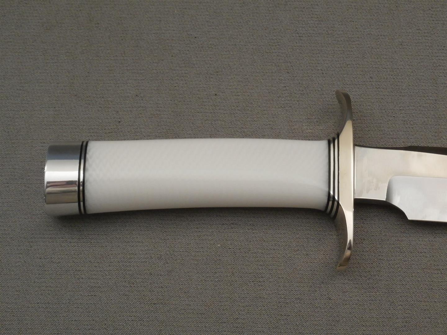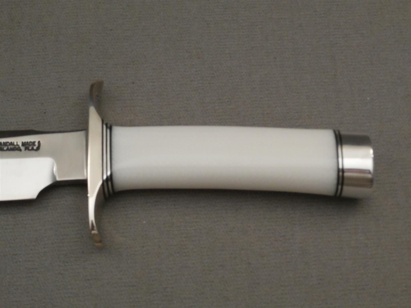 1/4″ stock. This is a heavily made dagger or dirk. 4 3/4″ – 5″ leather handle is shaped along lines of famous British Commando knife but is larger, stronger and has a more comfortable grip. Brass double hilt. Duralumin butt cap.