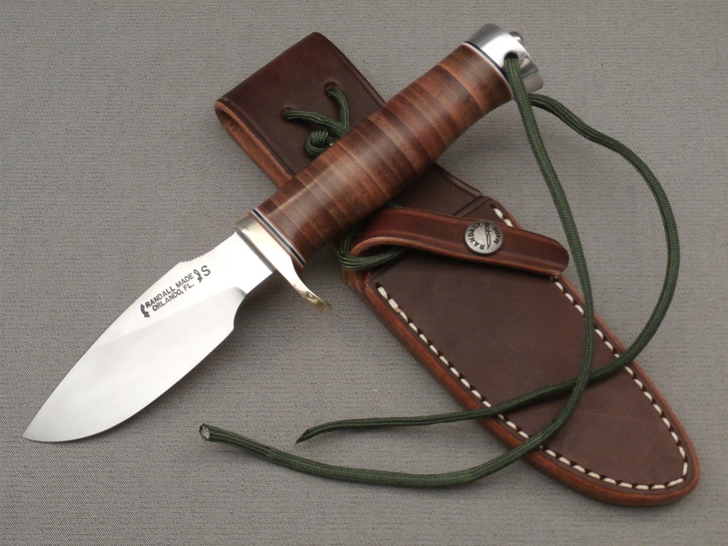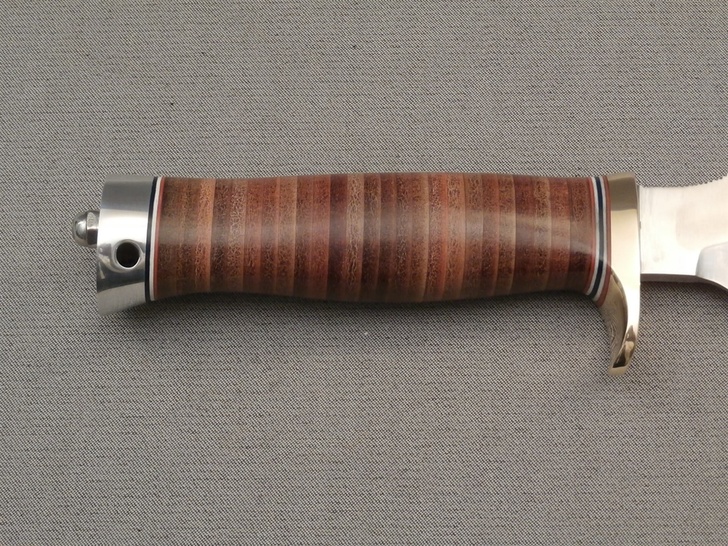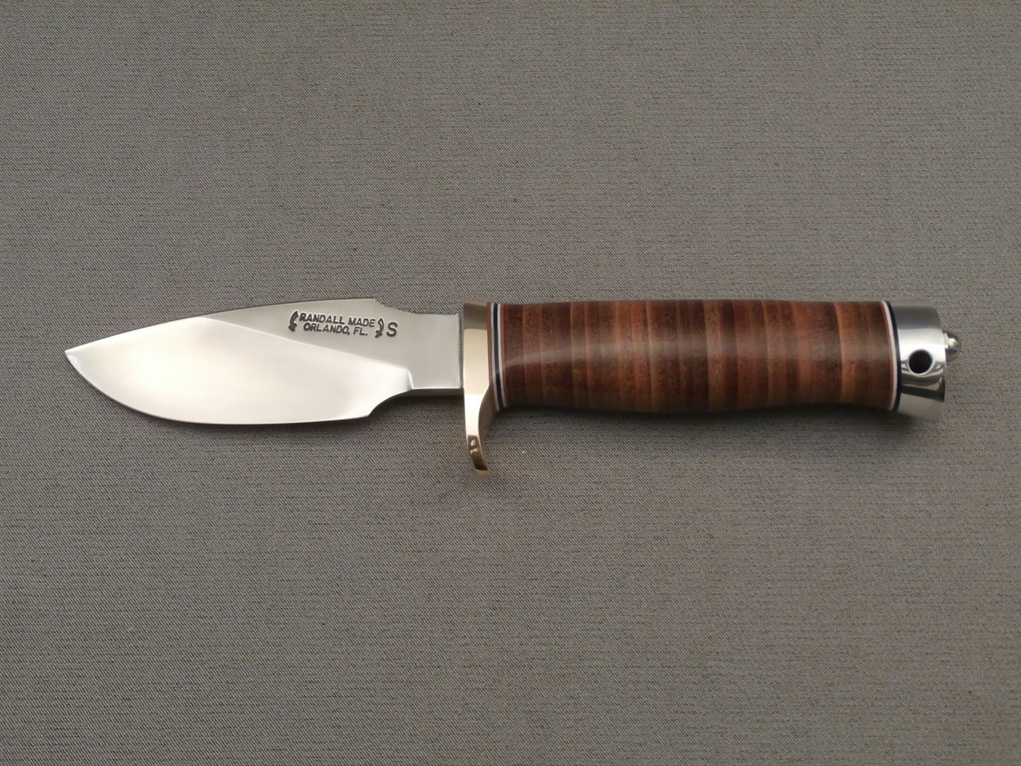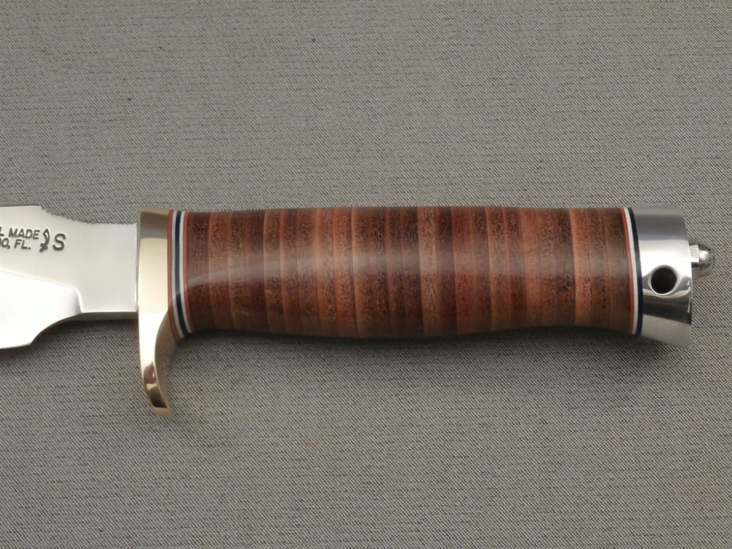 The original drop-point blade. Designed by Tommy Thompson, noted Alaskan guide, in 1952 for big-game skinning, with point dropped below top of blade to prevent cutting too deeply through skins when used point first. Top of blade in front of hilt notched for thumb placement.