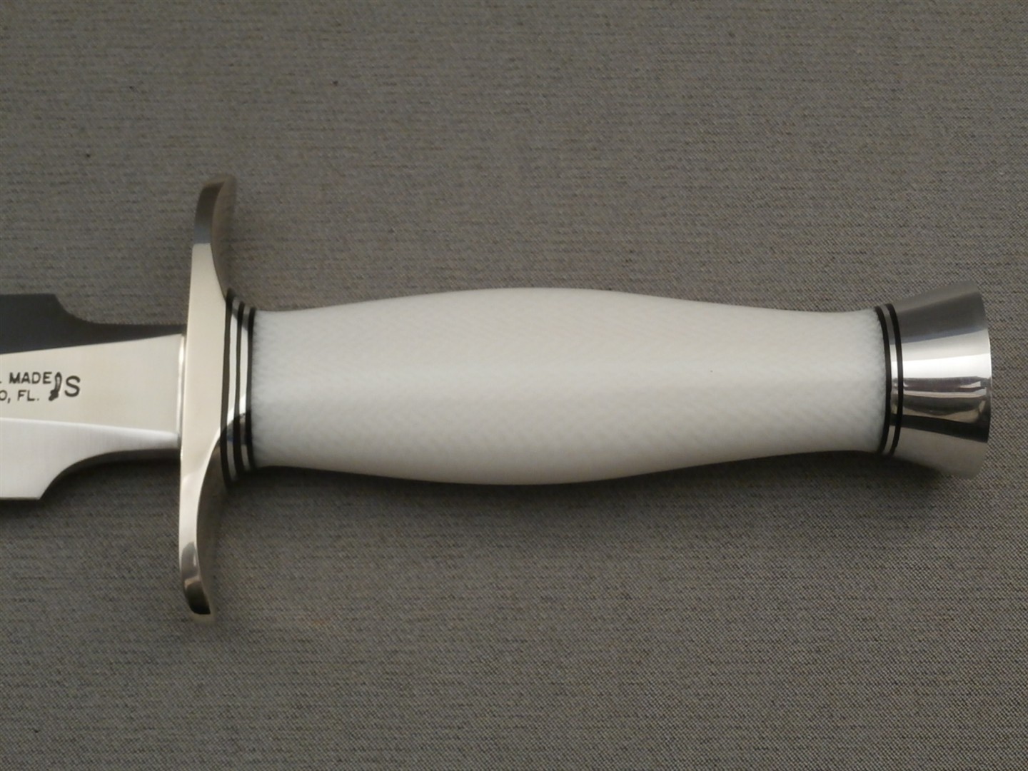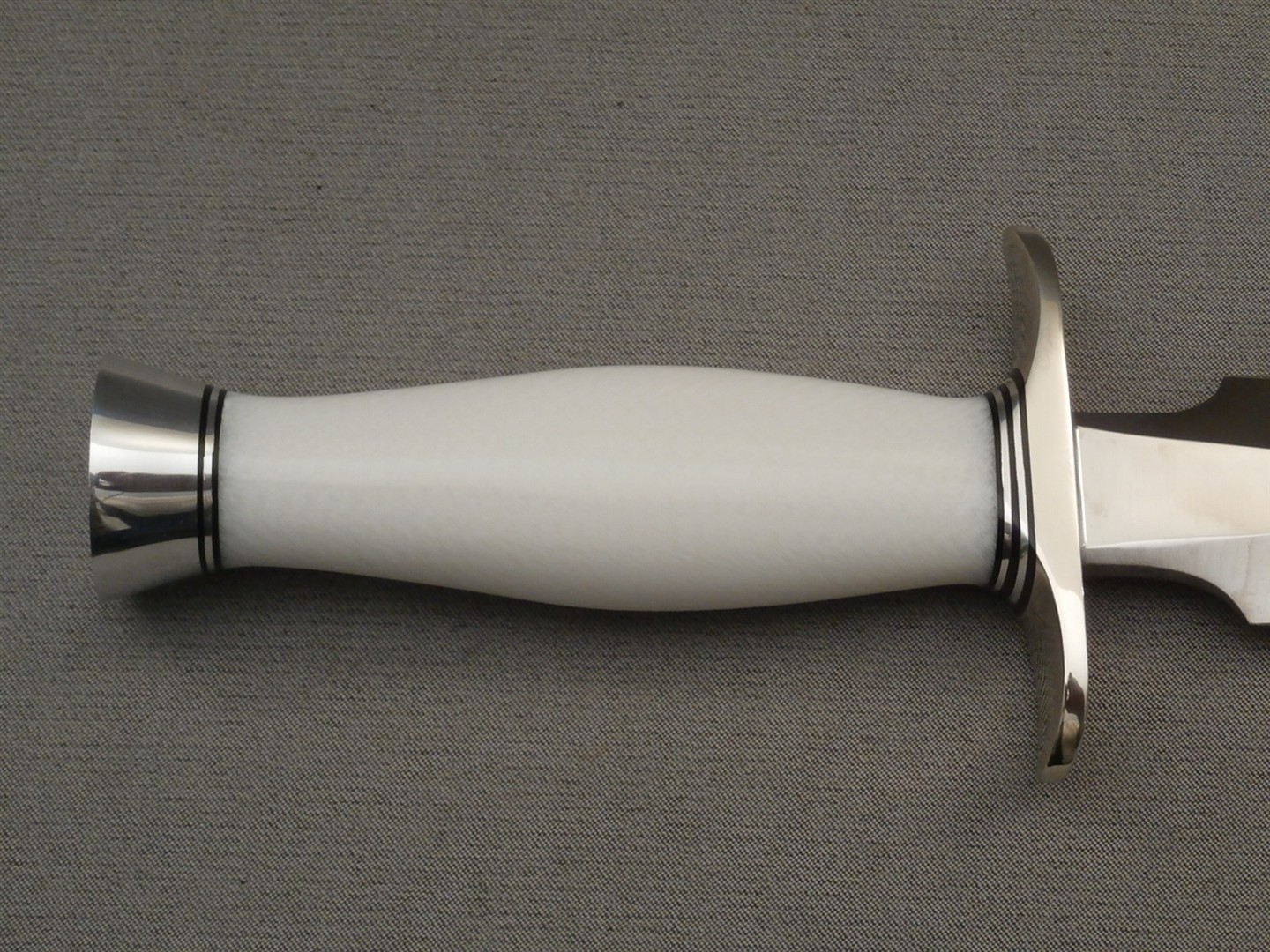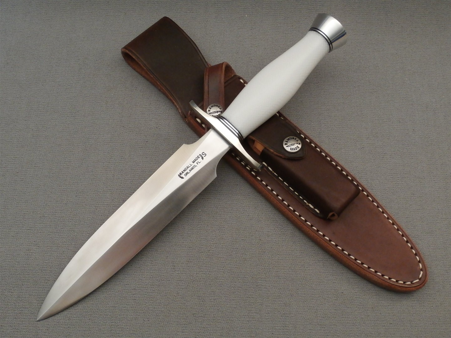 1/4″ stock. This is a heavily made dagger or dirk. 4 3/4″ – 5″ leather handle is shaped along lines of famous British Commando knife but is larger, stronger and has a more comfortable grip. Brass double hilt. Duralumin butt cap.
