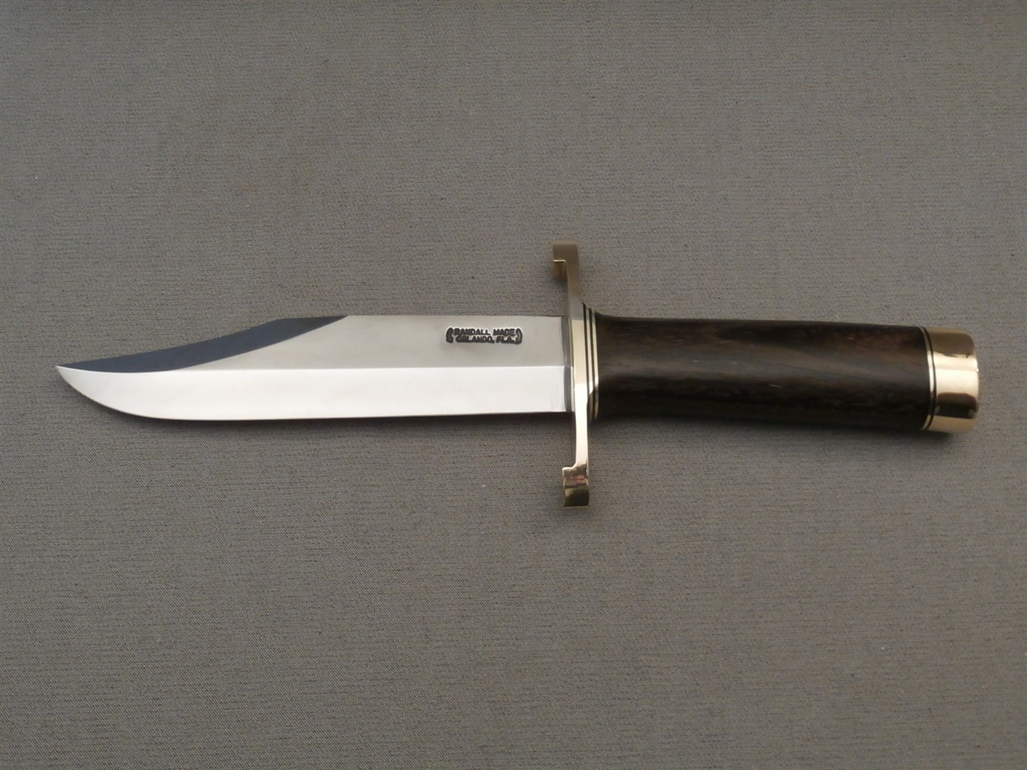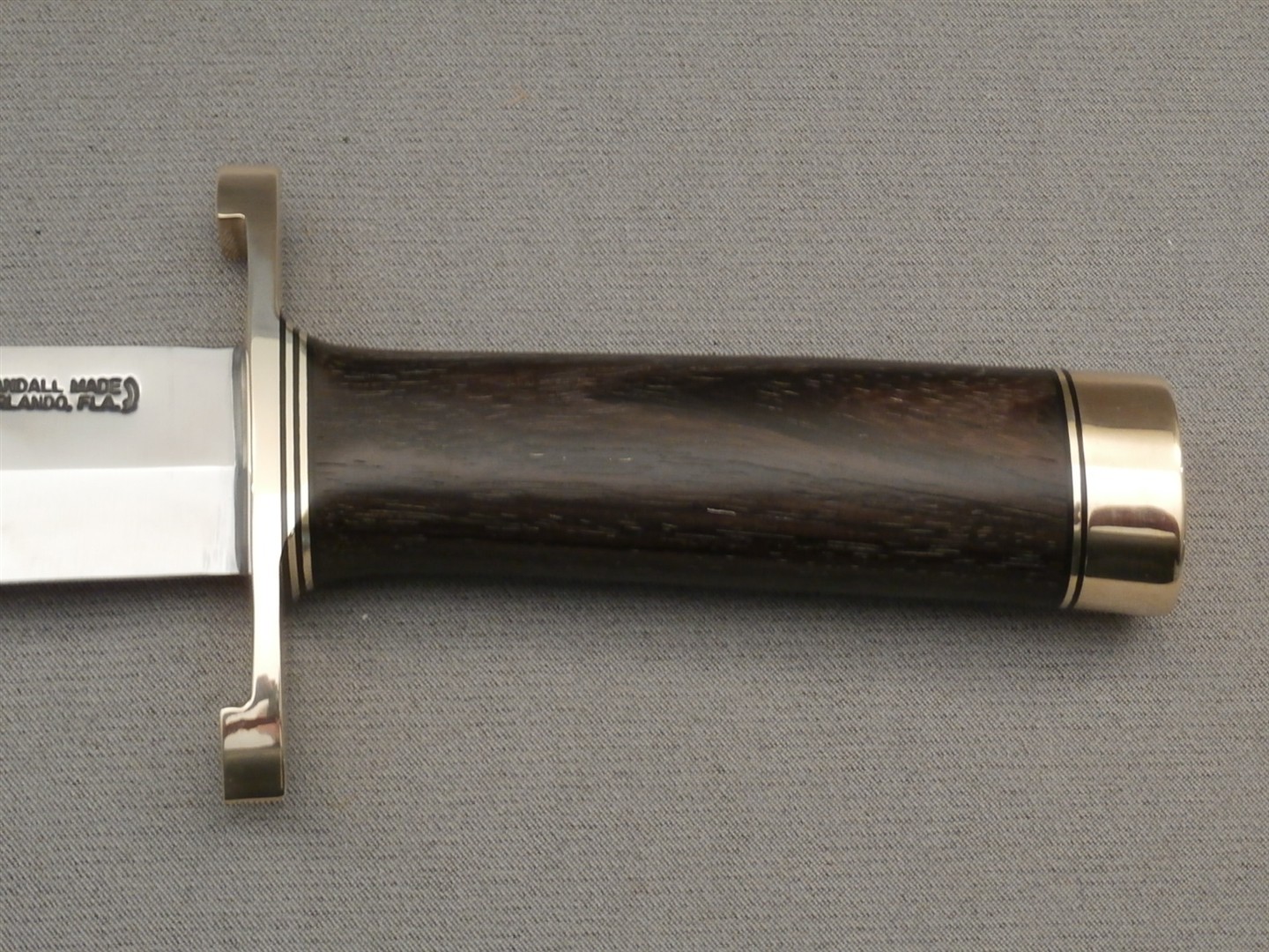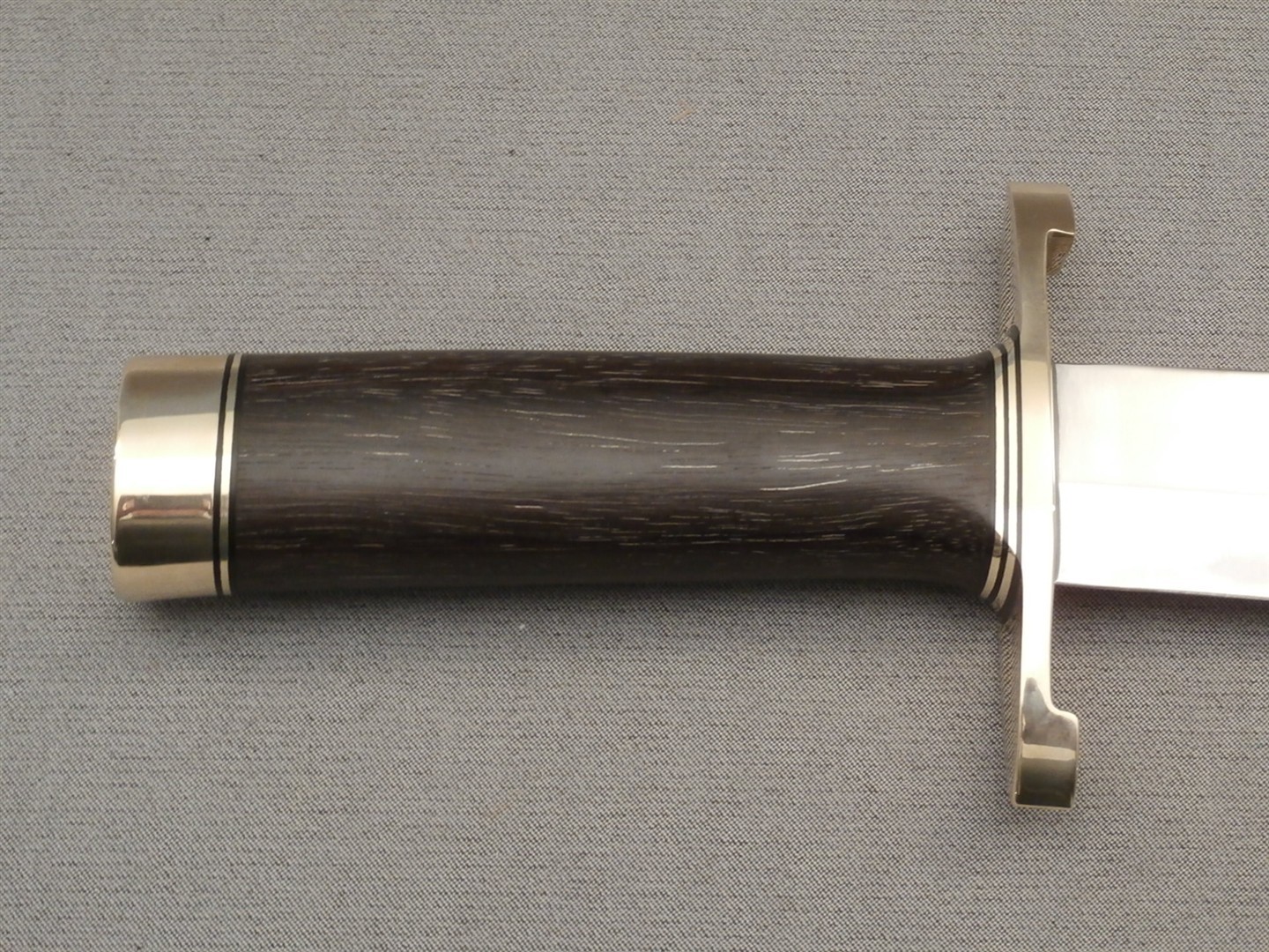 6″ blade brass lugged hilt brass/black spacers rosewood handle brass butt cap brown leather sheath