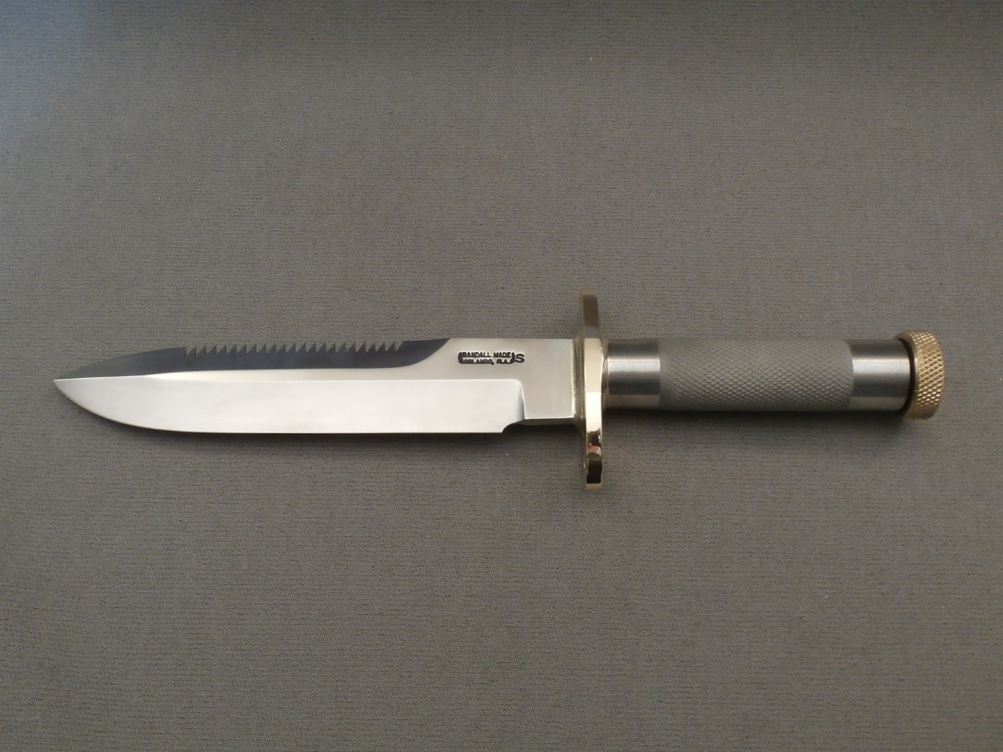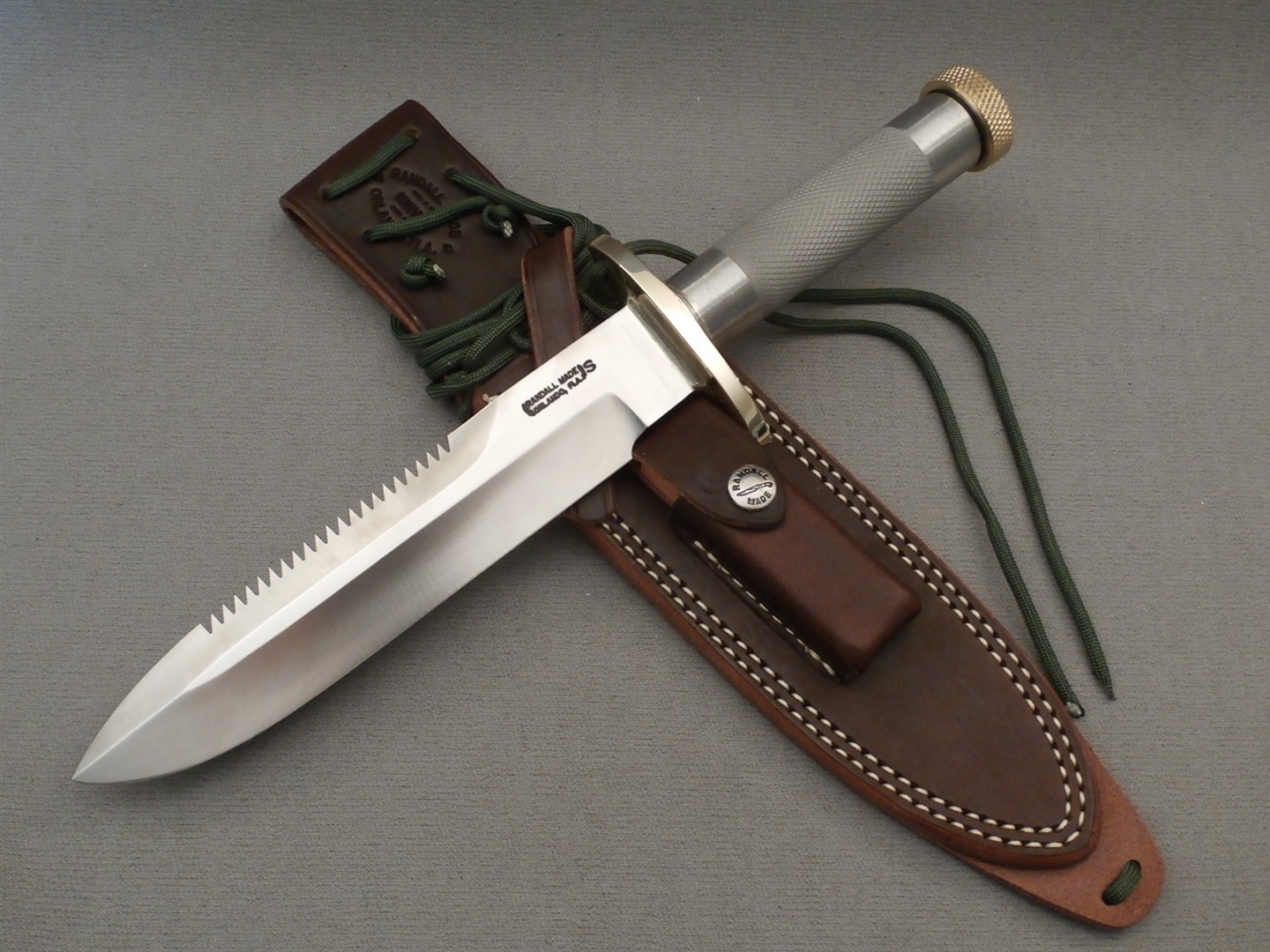 Blade length of 7 1/2″ or 5 1/2″ with sawtooth edge on top (sawteeth not offset). Approx 4 3/4″ stainless steel tubular handle, 1″ diameter, silver soldered to 1/4″ oblong brass hilt, fitted with removable, threaded brass butt cap and waterproof “O” ring. Flared holes in top and bottom of hilt accommodate wrist thong.