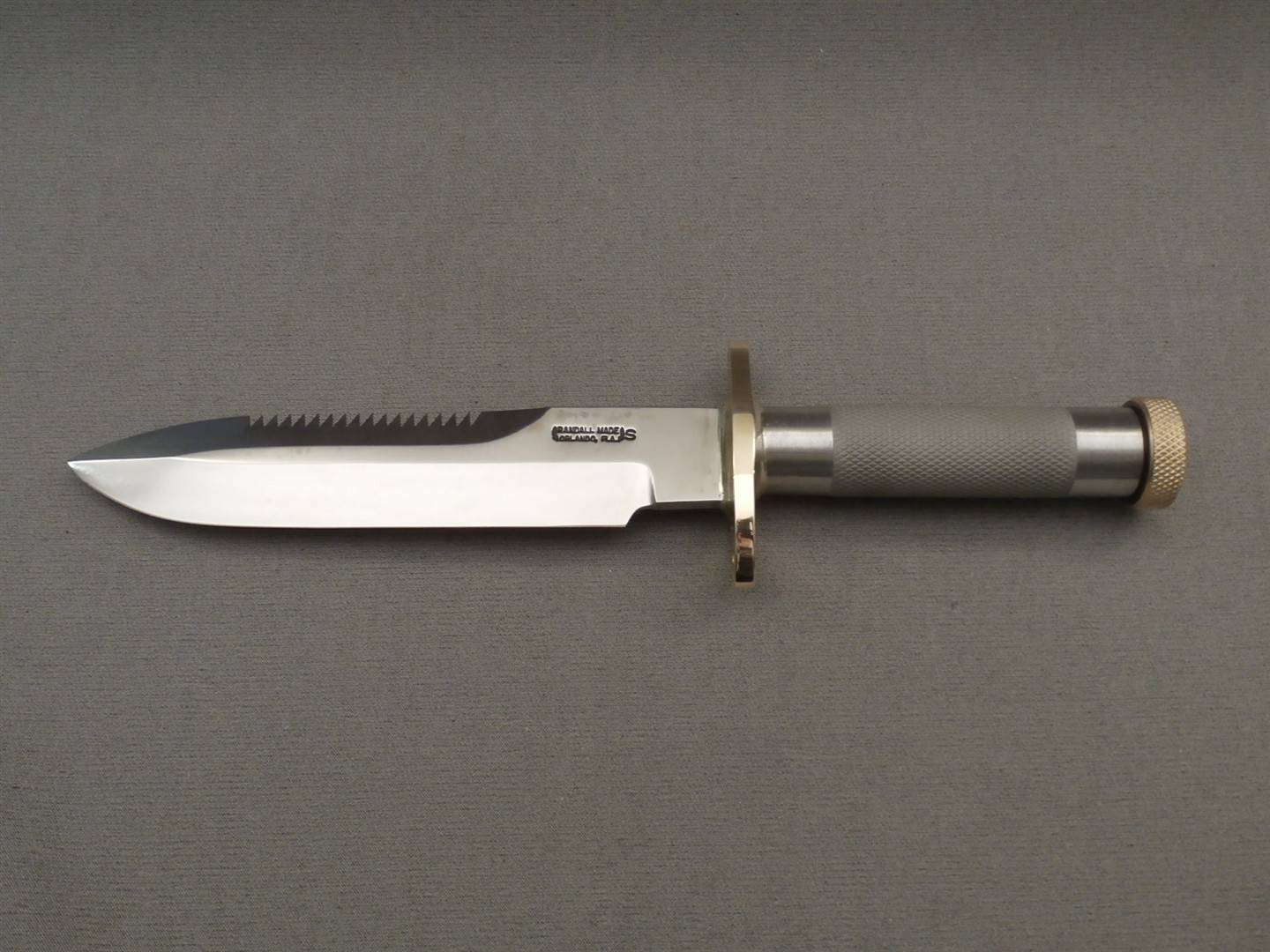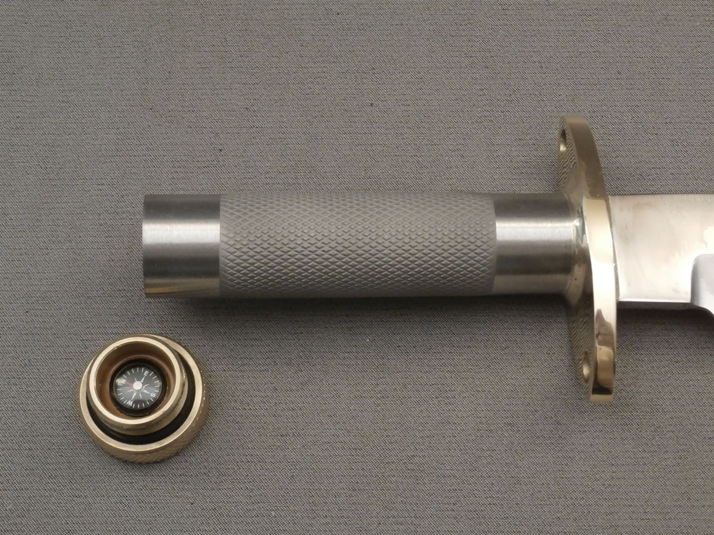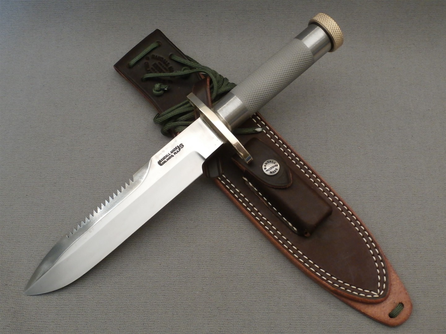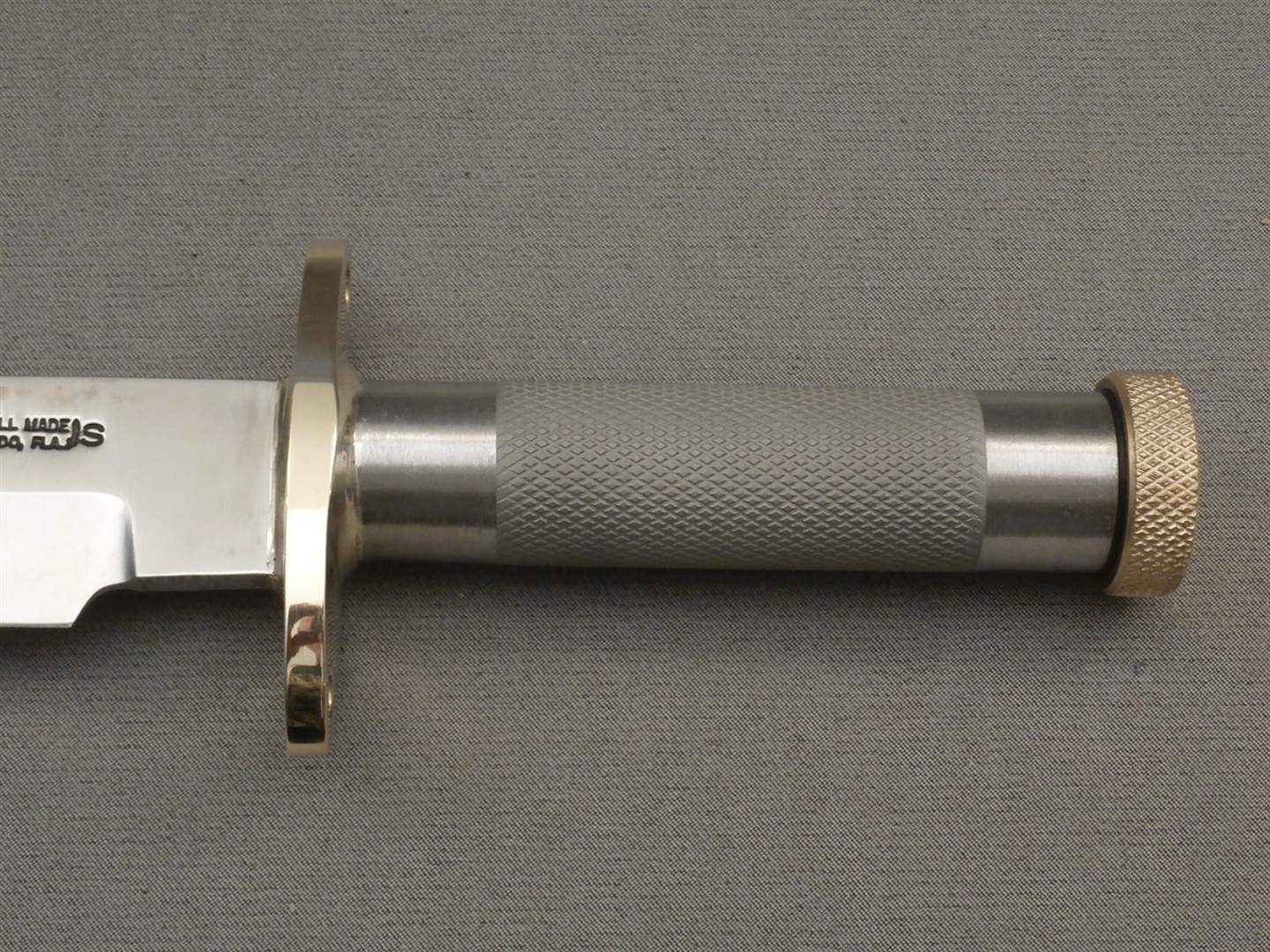 Blade length of 7 1/2″ or 5 1/2″ with sawtooth edge on top (sawteeth not offset). Approx 4 3/4″ stainless steel tubular handle, 1″ diameter, silver soldered to 1/4″ oblong brass hilt, fitted with removable, threaded brass butt cap and waterproof “O” ring. Flared holes in top and bottom of hilt accommodate wrist thong.