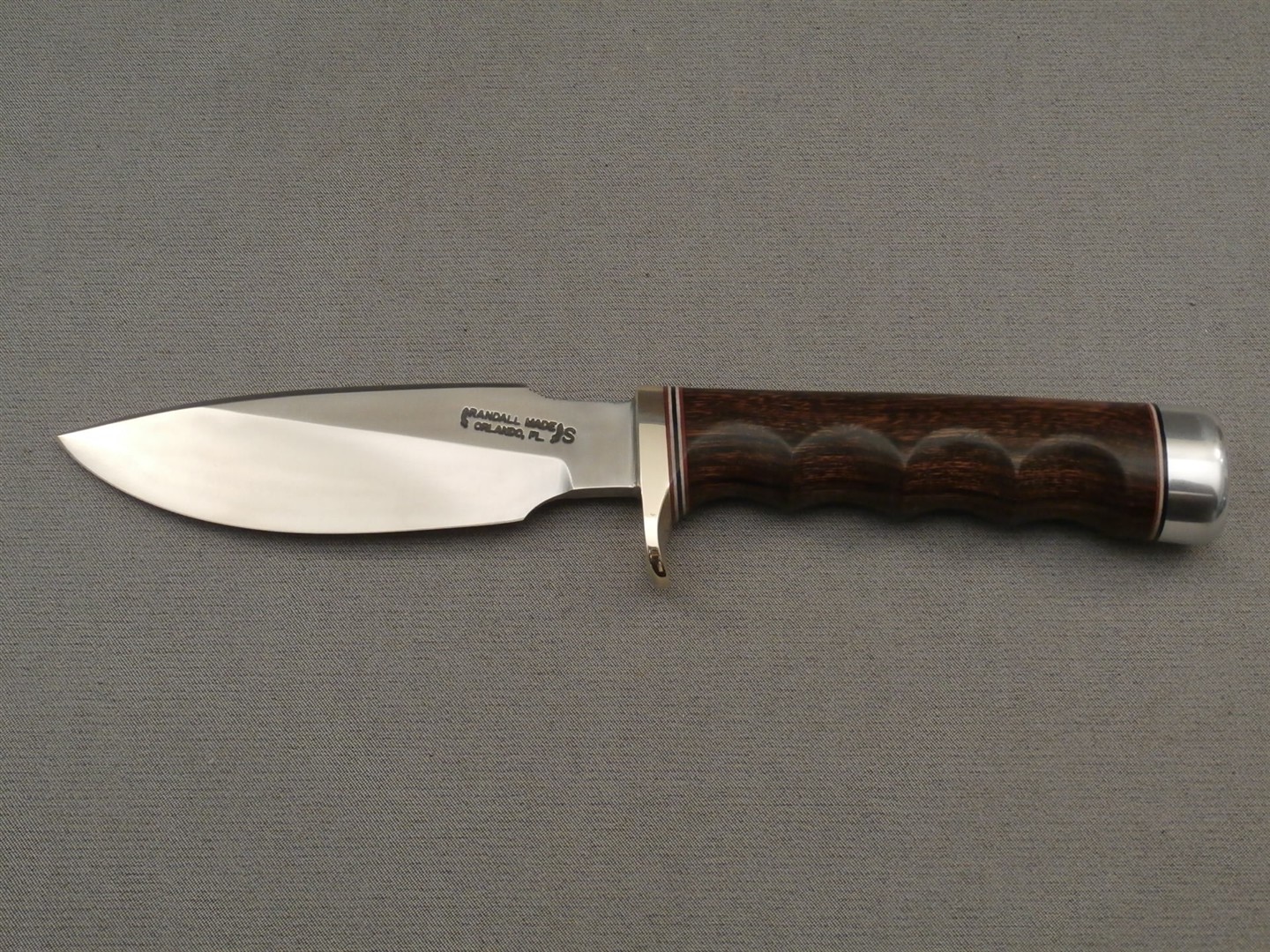 The original drop-point blade. Designed by Tommy Thompson, noted Alaskan guide, in 1952 for big-game skinning, with point dropped below top of blade to prevent cutting too deeply through skins when used point first. Top of blade in front of hilt notched for thumb placement.