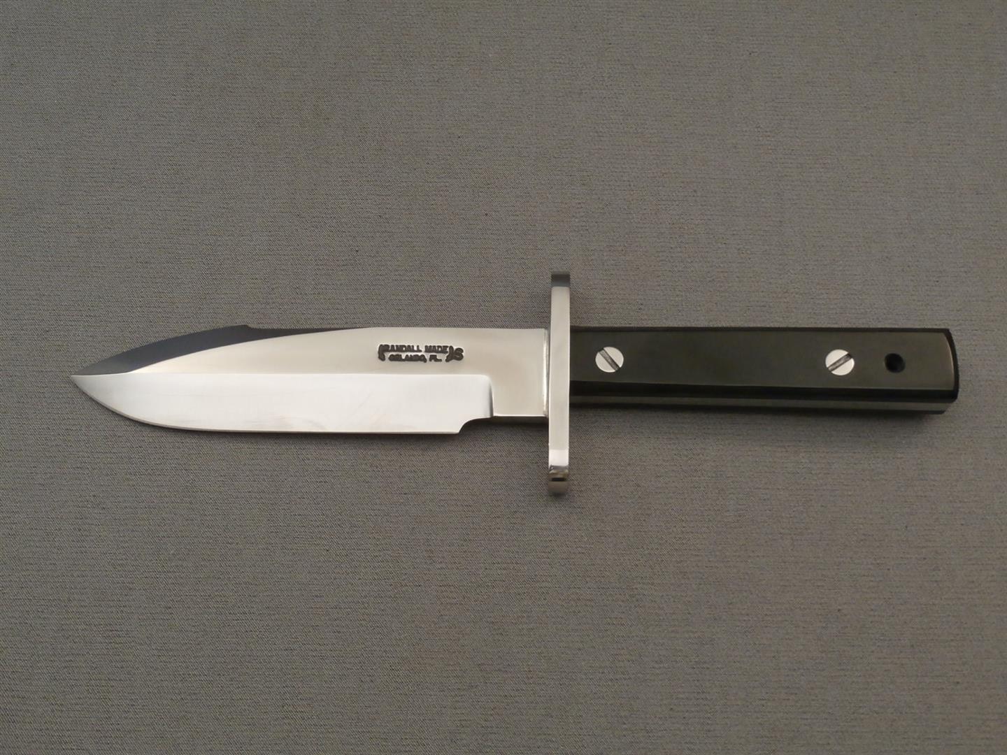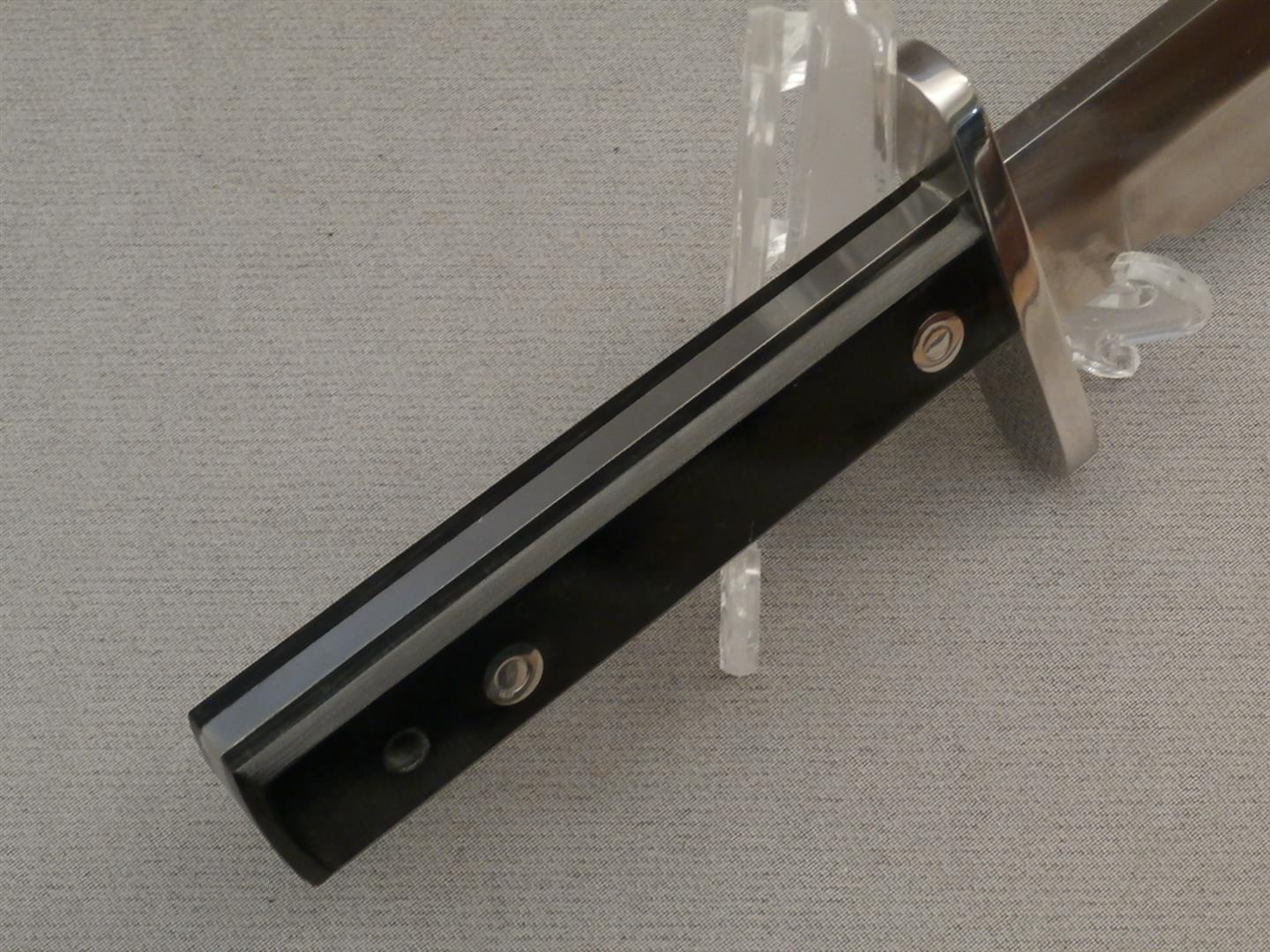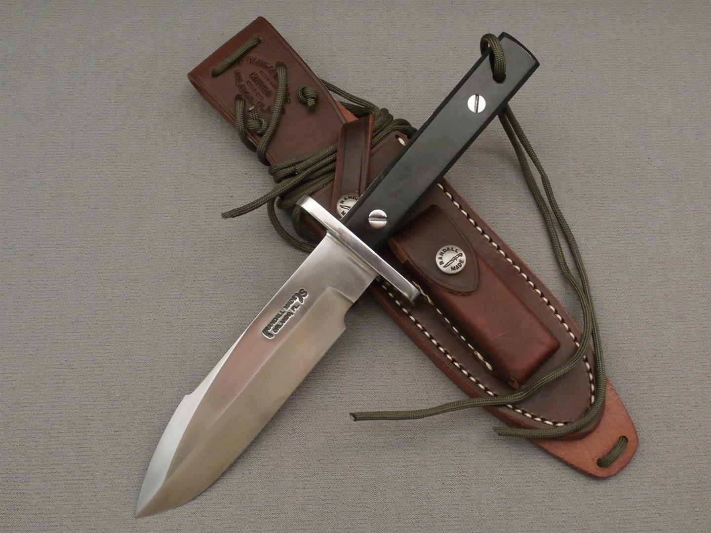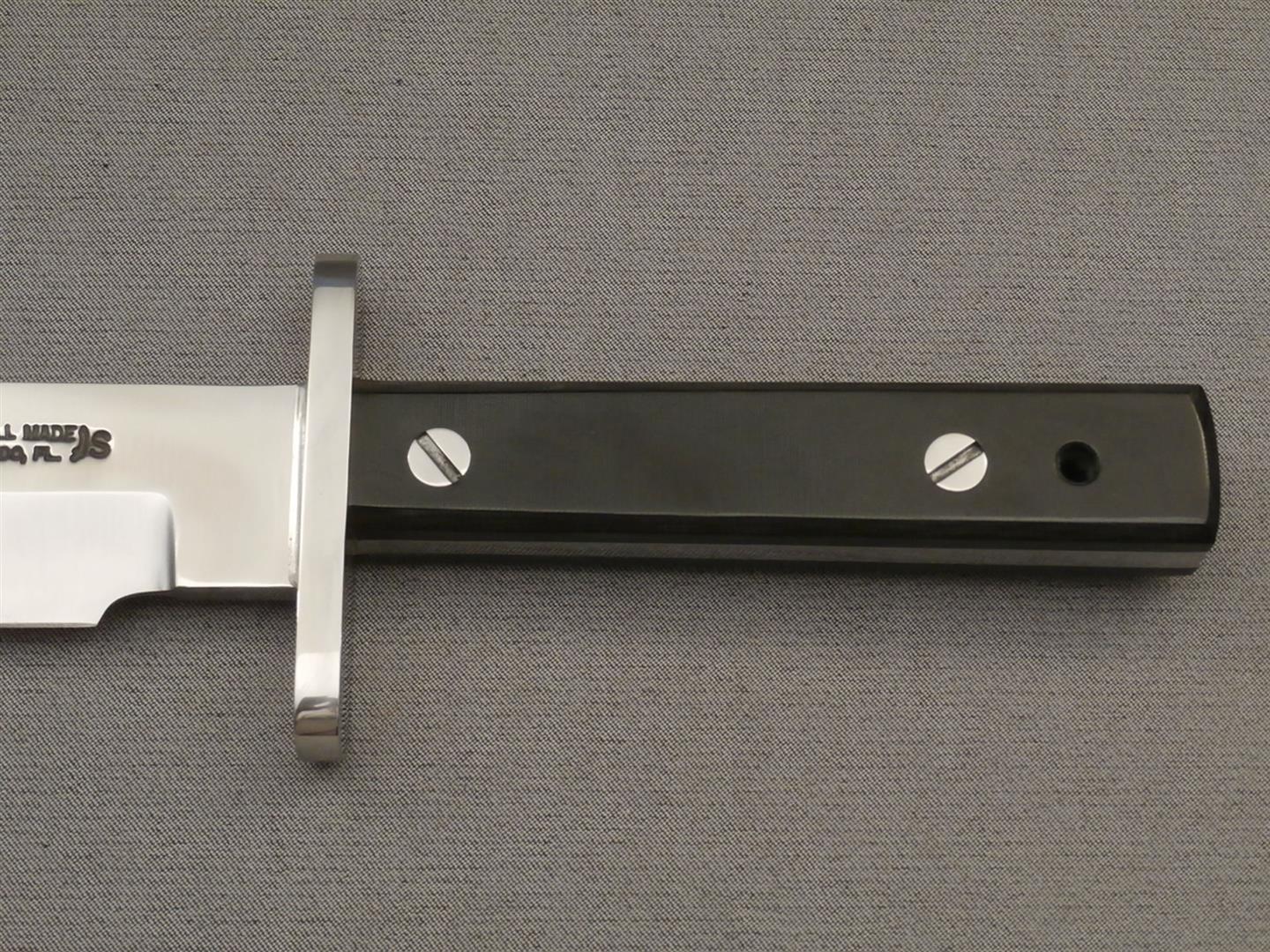 4 3/8” black Micarta handle, fastened with removable stainless steel bolts. A slot in the heavy tang and matching hollow inside the handle may be used to carry matches, fishhooks, line and other survival items. Large stainless steel hilt, silver-soldered. Wrist thong. This model was especially designed for the seven Mercury astronauts, who carried them on America’s first manned space flights. Astronaut Gordon Cooper did the final design, and two of these historically valuable knives are on display in the Smithsonian Institution.